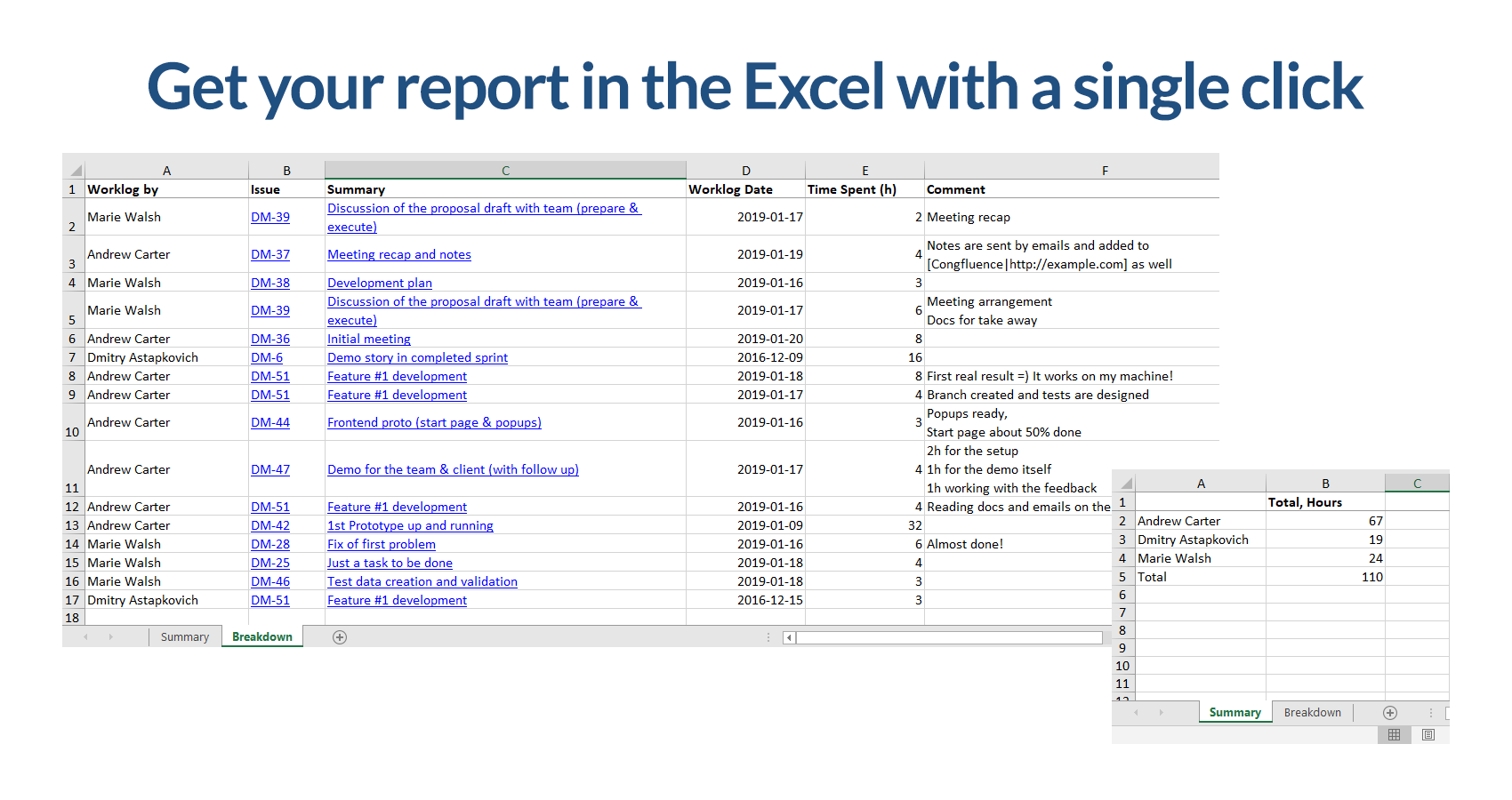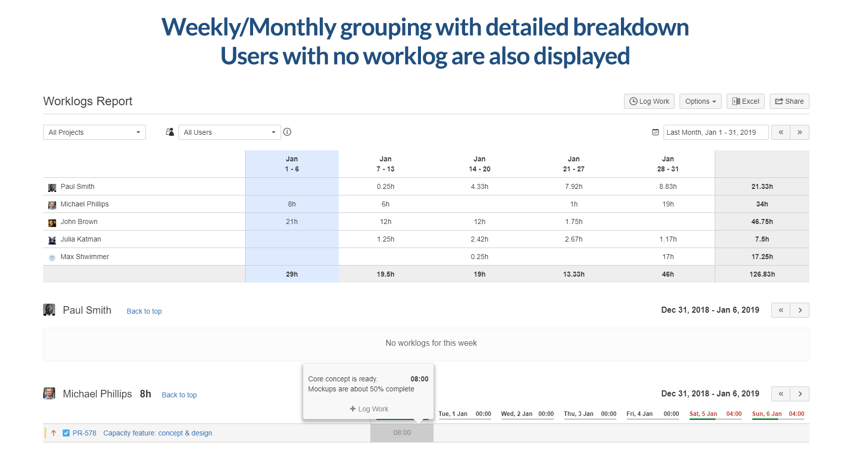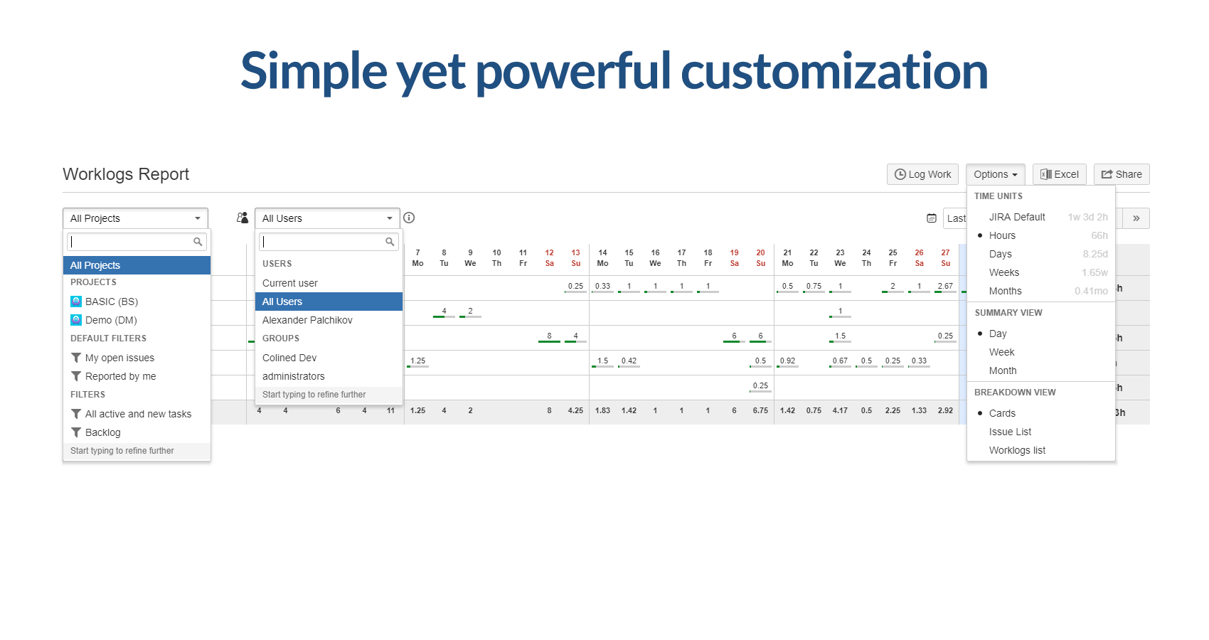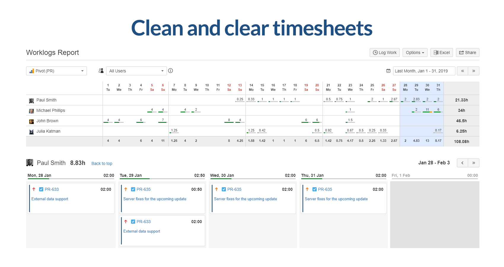 Worklogs Report provides clean and beatiful timesheets for the Atlassian JIRA. It’s avaiable for all Jira types: Cloud, Server and Data Center.