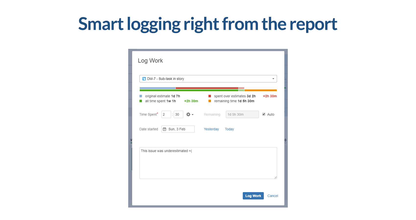 Example of a report view where data is pivoted based on users and worklogs, not issues. That may helpful if you have few long lasting issues with multiply worklogs entries.